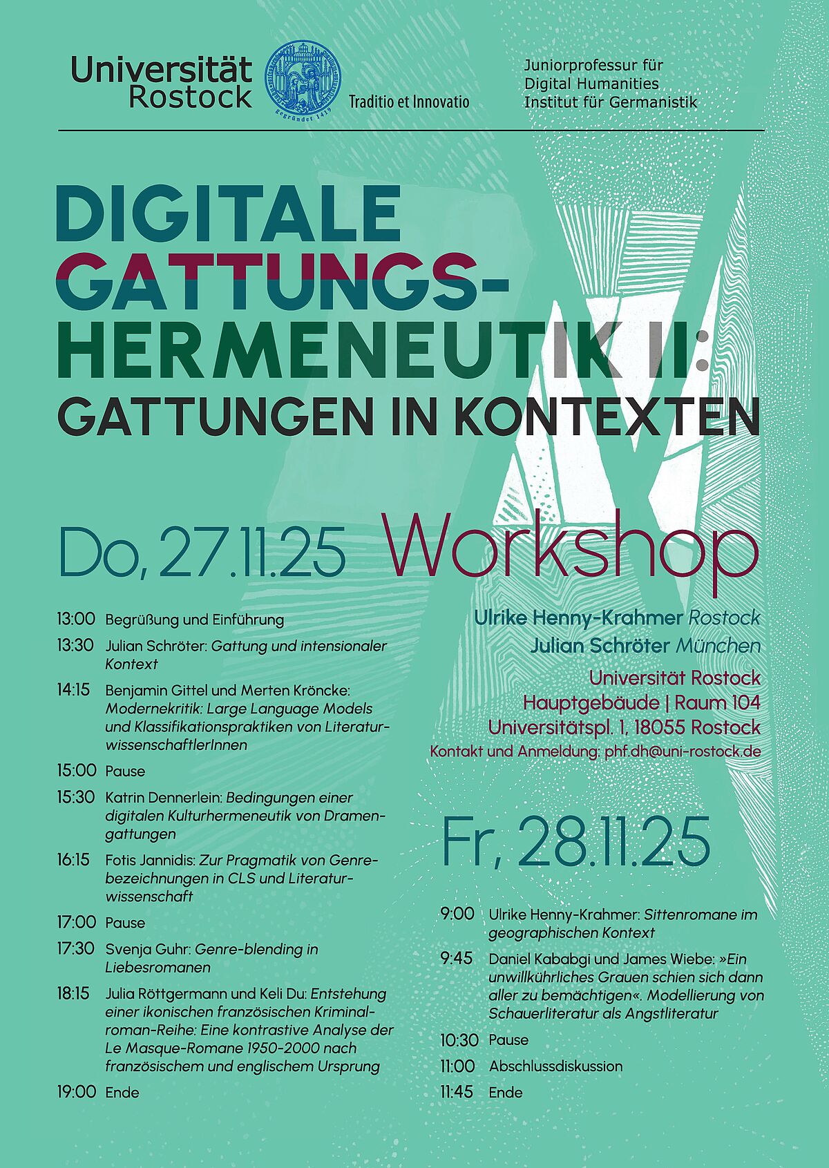 Veranstaltungsartikel der Universität RostockAus hermeneutischer Sicht können Gattungen als Kontexte literarischer Werke verstanden werden, die einerseits deren Entstehung, Rezeption und Interpretation und andererseits auch Strukturen, Inhalte und Stil der Werke beeinflussen. Vergleichsweise wenig Aufmerksamkeit hat die Forschung in Literaturwissenschaft und Computational Humanities dem Sachverhalt gewidmet, dass literarische Gattungen selbst ebenfalls in sehr unterschiedliche Kontexte eingebettet sind. Am besten untersucht ist der zeitliche Kontext (Underwood 2016, 2019), aber es gibt noch mehr: soziale, sprachliche, kulturelle, geographische, mediale und materielle Kontexte, in denen sich Gattungen entfalten (zur medialen Bedingtheit von Gattung vgl. Meyer 1987; 1995). Der Workshop legt einen Schwerpunkt auf die Betrachtung, Modellierung und Analyse solcher Kontexte als Teil der Untersuchung literarischer Gattungen mit digitalen Methoden (Hesselbach et al. 2024). Auch werden die Erschließung neuer Korpora (Henny-Krahmer 2023), neuere methodische Entwicklungen der digitalen Gattungsanalyse, etwa hinsichtlich des Einsatzes von Large Language Models und Machine Learning, in den Blick genommen. Darüber hinaus widmet sich der Workshop praxeologischen Perspektiven auf Gattung (Martus/Spoerhase 2022, Gittel 2021), der Frage nach der begrifflichen Verfasstheit und Vagheit von Gattungen (Schröter 2025) sowie dem Verhältnis von Gattung und Literaturgeschichte (Gymnich et al. 2017). Insgesamt soll der aktuelle Stand der Forschung zu literarischen Gattungen innerhalb der Computational Literary Studies reflektiert und diskutiert werden.