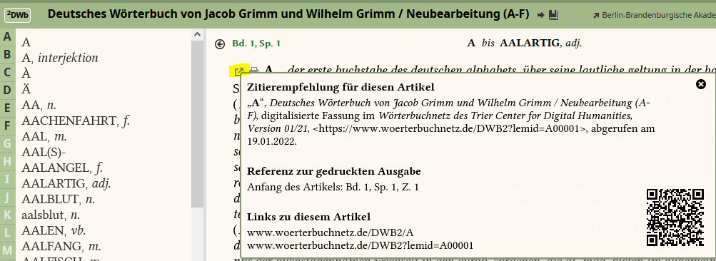 In the past, the TCDH has repeatedly received requests from educational institutions and museums to use the Trier dictionary network as part of exhibitions. In our own exhibition “2018 - 20 Years of TCDH - 180 Years of the German Dictionary”, we used QR codes on exhibits ourselves, as they allow interactive and quick access to the word articles of the dictionary network. Now, QR codes are available to the general public and the professional community in the portal of the dictionary network, which can be accessed via the citation recommendations for the respective articles. This new feature can be used for the 20 dictionaries and reference works that were created as part of the digitization projects carried out at the TCDH. This new feature, integrated by Dr. Thomas Burch, is just one of numerous further developments to the Trier research tool.